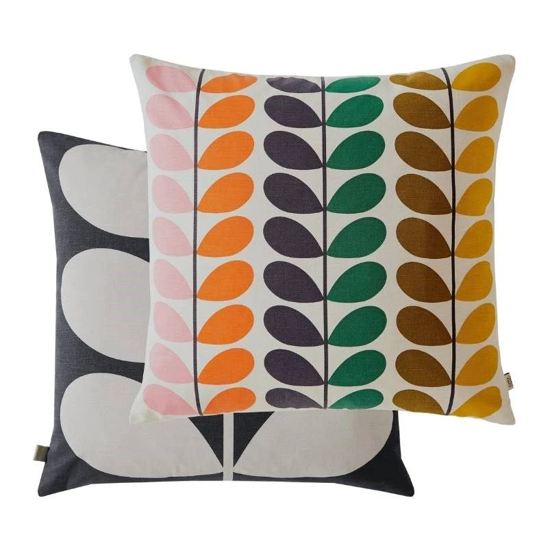 This Orla Kiely cushion features the iconic Multi Stem print on the front and the large scale monochrome stem print on the reverse. Warm shades of light pink, orange, charcoal, green, brown and mustard. This is a standout cushion either alone or mixed in with your favourite Orla Kiely cushions for a bold statement.