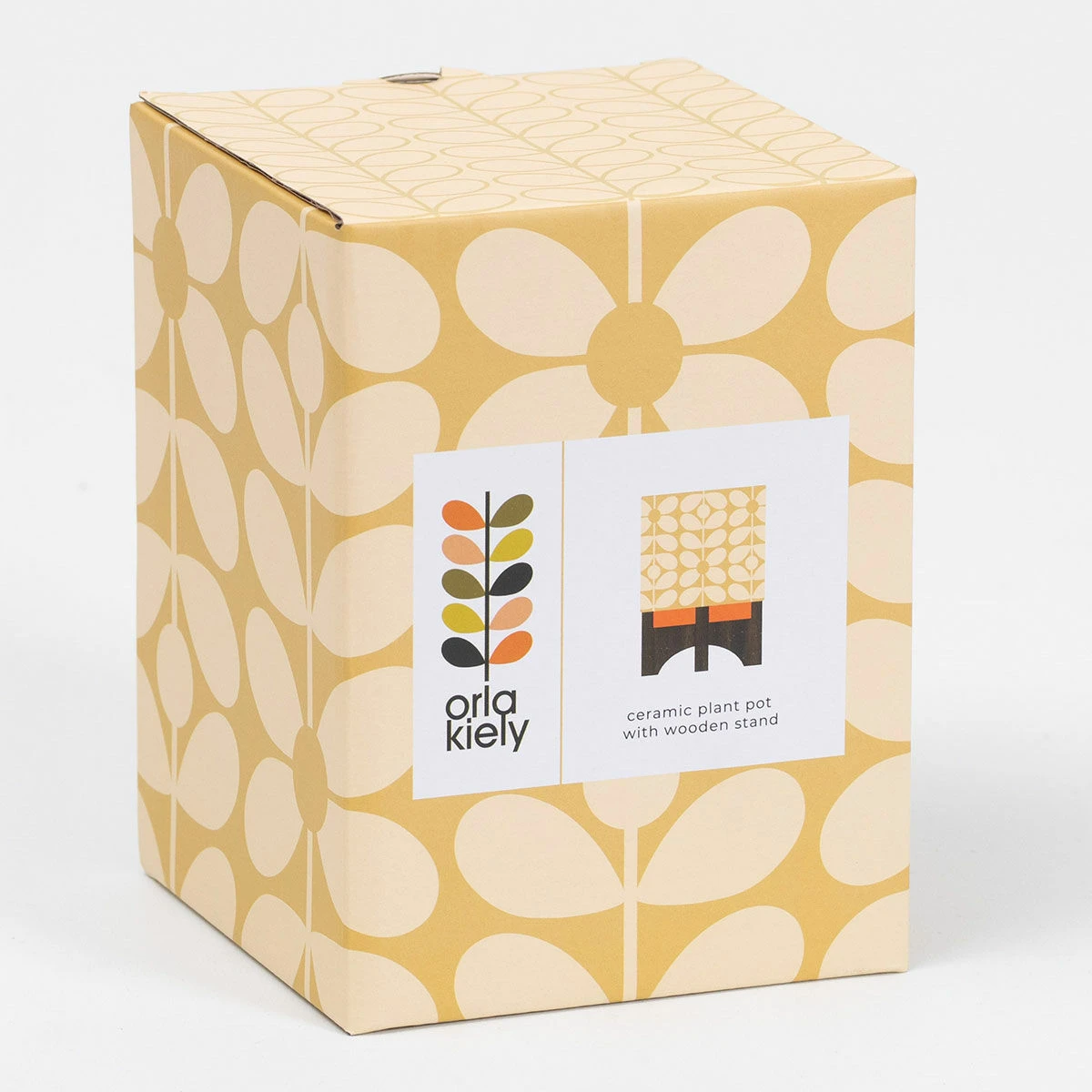 The plant pot features the ‘Sixties Stem’ design; leaves along a stem which have been debossed onto ceramic. The glossy cream pot features a vibrant orange stepped base which allows it to sit neatly onto its wooden stand which raises it, adding another dimension to the retro style.