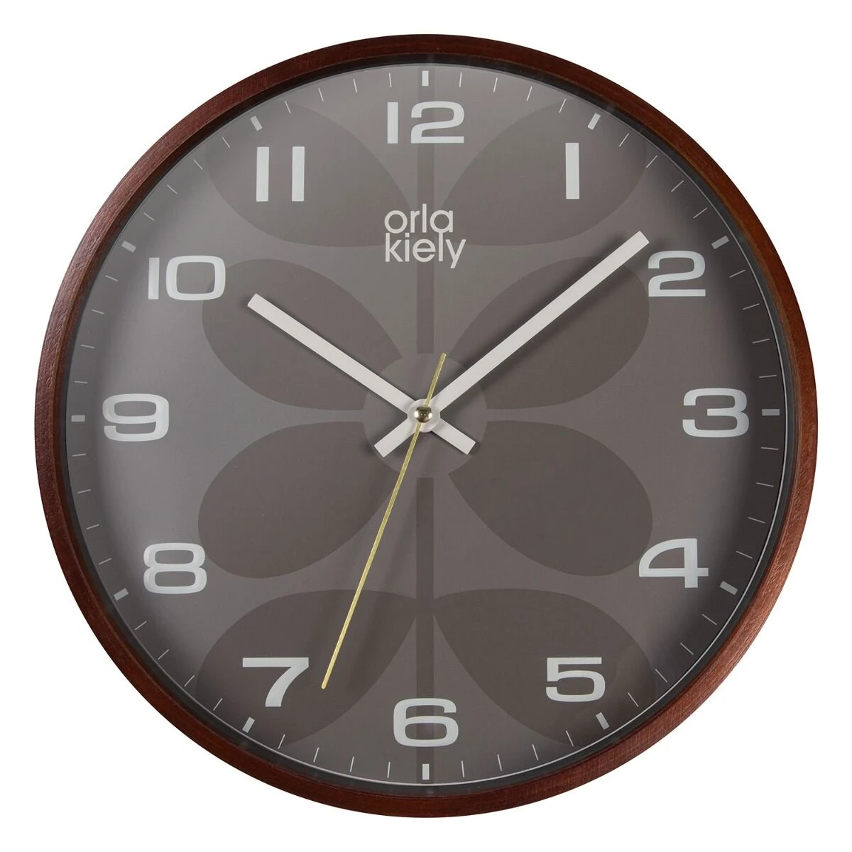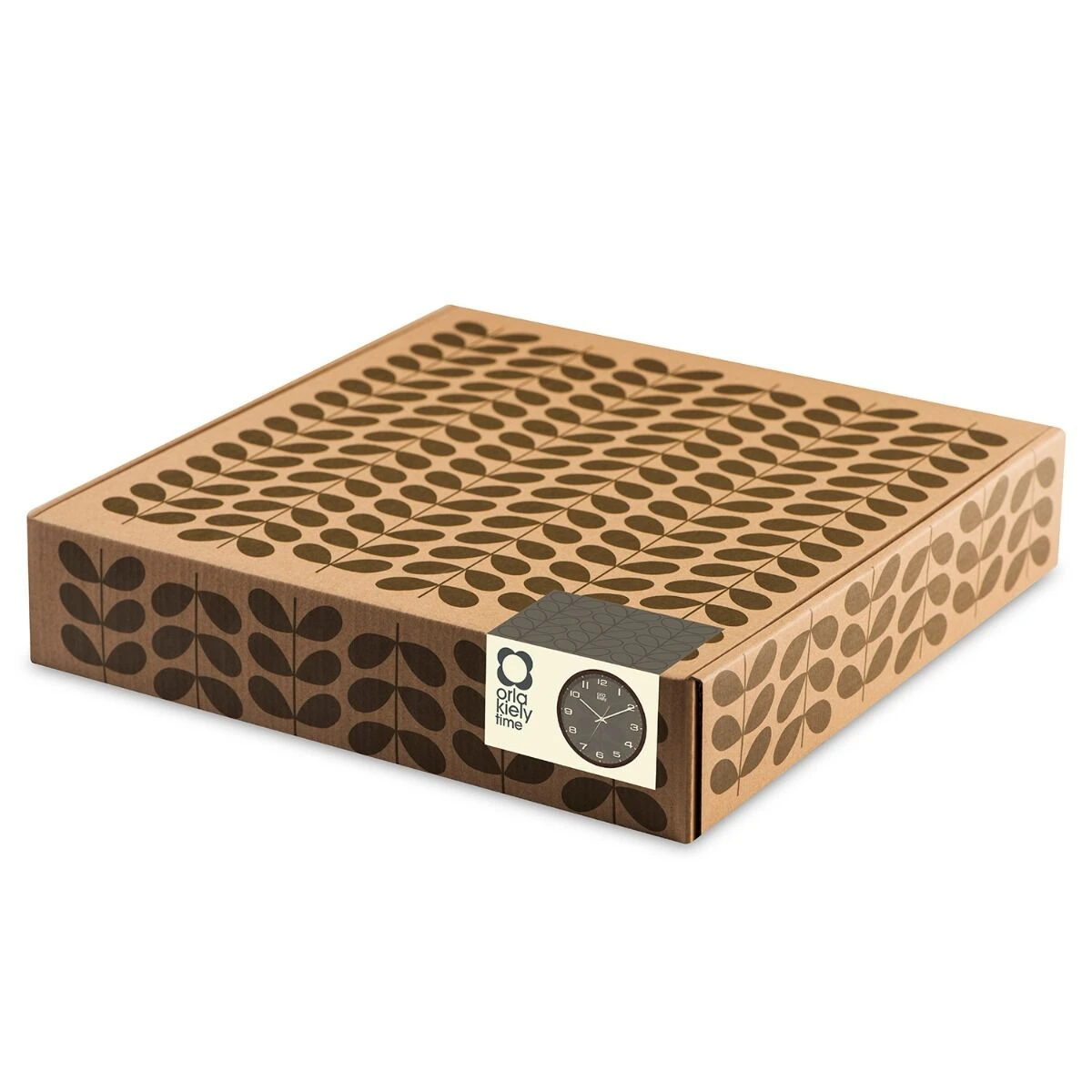 The design on the face of this Orla Kiely clock is a charcoal grey coloured version of her ‘block stem’ pattern, leaves facing up and down the centre set upon a steel grey background. The face of this stylish clock features 3 hands; the second hand is brass whilst the minute and hours hands are cool white. Matching the white hands are 12 hour numbers and second dashes which are displayed around the clock face making it easy to read. The face is finished with the Orla Kiely branded logo and is designed with a glass front and a smooth wooden surrounding edge to complete the retro inspired look.