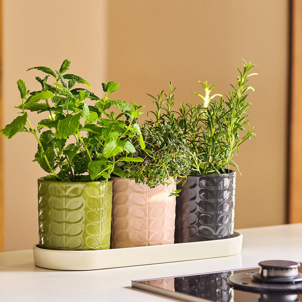 Keep your herbs or indoor plans together on your kitchen window ledge in this set of three pots from Orla Kiely.