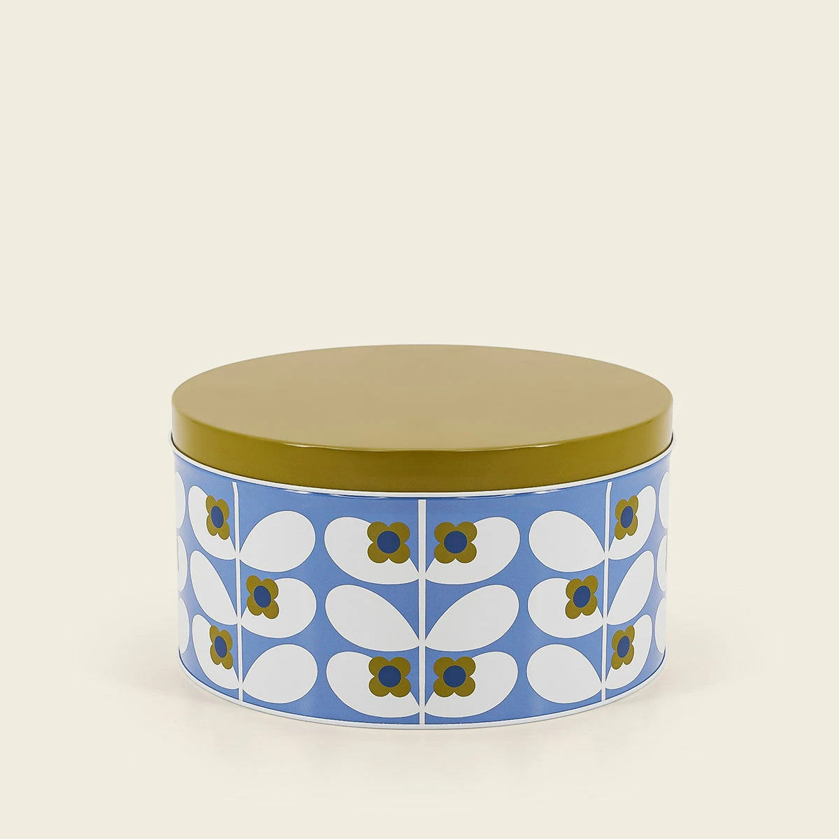 The medium tin 22cm in diameter features the ‘Wild Rose Stem’ design; white leaves upon a stem with small mustard four-petal flowers which alternate along the leaves and repeat across a blue background. The tin is topped with a mustard solid block colour push on lid.